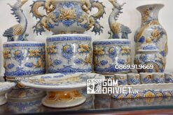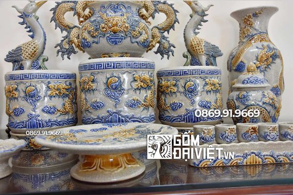 Màu sắc của bộ sản phẩm này cũng chính là màu sắc của loại men sử dụng – men lam rạn cổ. Màu sắc này sẽ mang đến cho không gian thờ cúng gia tiên sự sang trọng và trang nhã. Bên cạnh đó, hoa tiết rồng đắp nổi còn là điểm nhấn đặc biệt cho bộ đồ thờ. Do vậy, đây là lý do vì sao bộ đồ thờ cúng này được rất nhiều gia chủ yêu thích hiện nay.