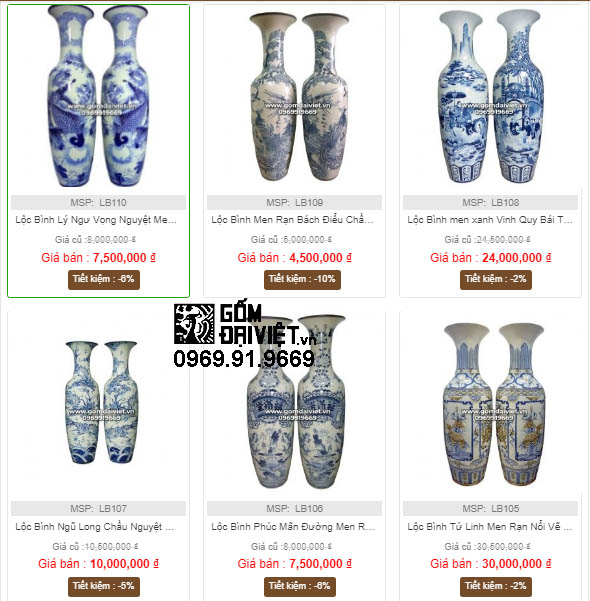 Nhằm đáp ứng nhu cầu chơi lọ lộc bình phong thủy đang ngày càng gia tăng, hiện nay đại lý gốm sứ Bát Tràng – Gốm Đại Việt đang cung cấp các sản phẩm gốm sứ Bát Tràng nói chung và lọ đại lộc bình, tiểu lộc bình nói riêng với chất lượng được đảm bảo và cam kết 100%.